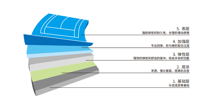 ◆ 复合型塑胶跑道是三层结构,底层同透气型跑道 一样,将橡胶颗粒按照比例与单组份聚氨酯粘合 剂混合均匀,采用摊铺设备制成缓冲弹性层,PU 聚氨酯弹性层铺设厚度2~3mm,面层为耐磨聚氨 酯面漆混合EPDM颗粒喷涂的耐磨层。这种跑道能 够满足一般田径场地的运动要求。