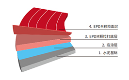 ◆ EPDM塑胶跑道主要由EPDM彩色胶粒层与黑色橡胶 底层组成,是固定式的赛场跑道材料。国际赛事标准的 EPDM跑道规格是13mm(6mmEPDM彩色胶粒层, 7mm橡胶层)。也可根据需求,加厚EPDM彩色胶粒层 至8mm左右。全天候使用,不会因紫外线,酸雨等的污 染而褪色,能长期保持其高水准的。